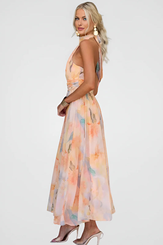 Elowen — Yellow Hibiscus Floral Halter Maxi Dress