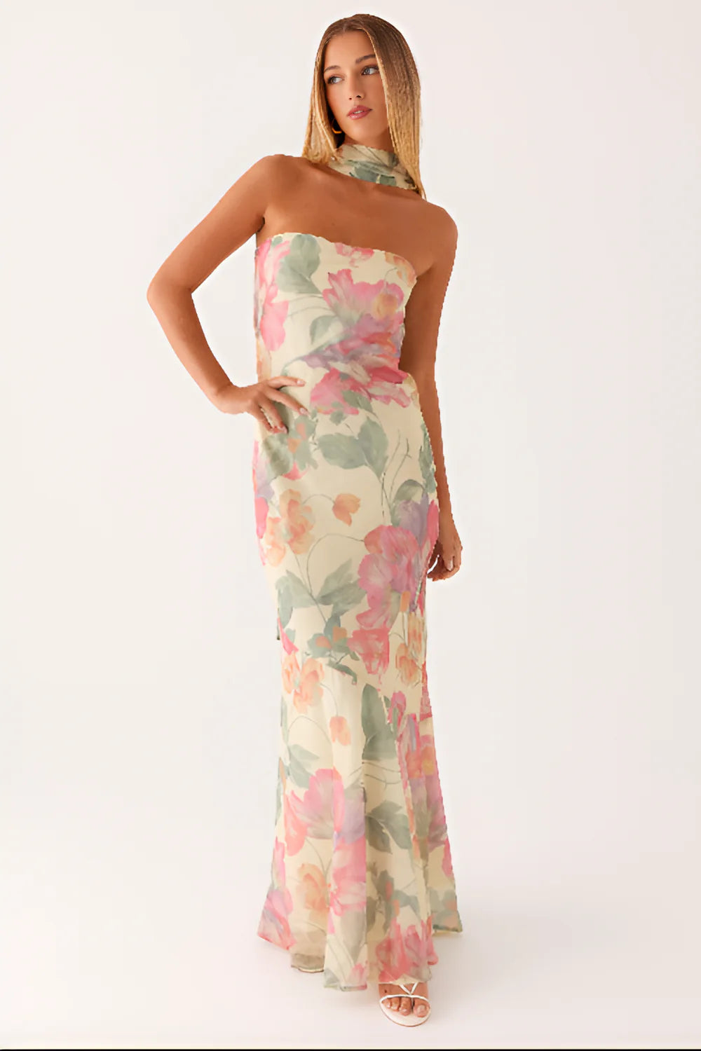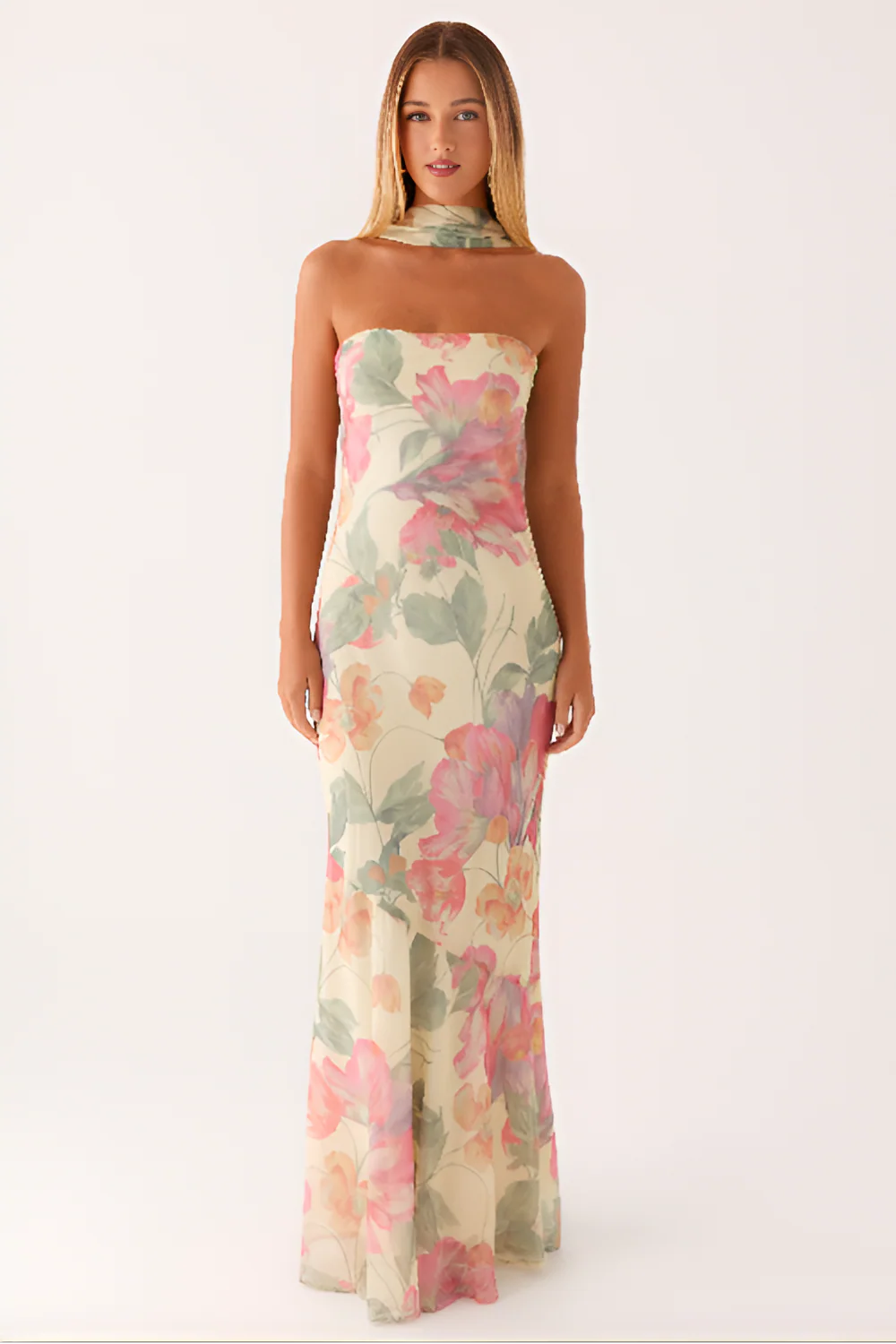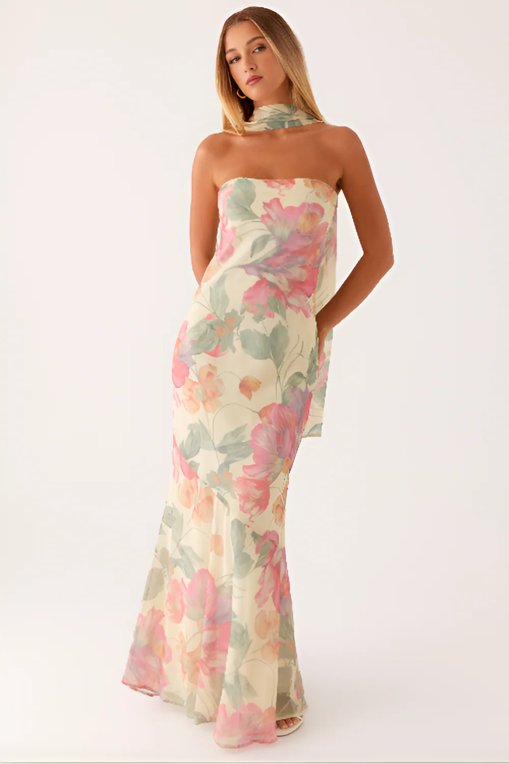 The Under The Pagoda Maxi Dress is more than a dress — it’s a statement. With its strapless neckline, flowing silhouette, and delicate floral print, it captures the beauty of golden evenings and makes every moment unforgettable.